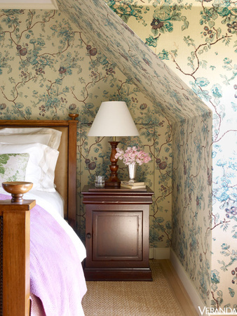 Rustic bedroom with floral patterns.
